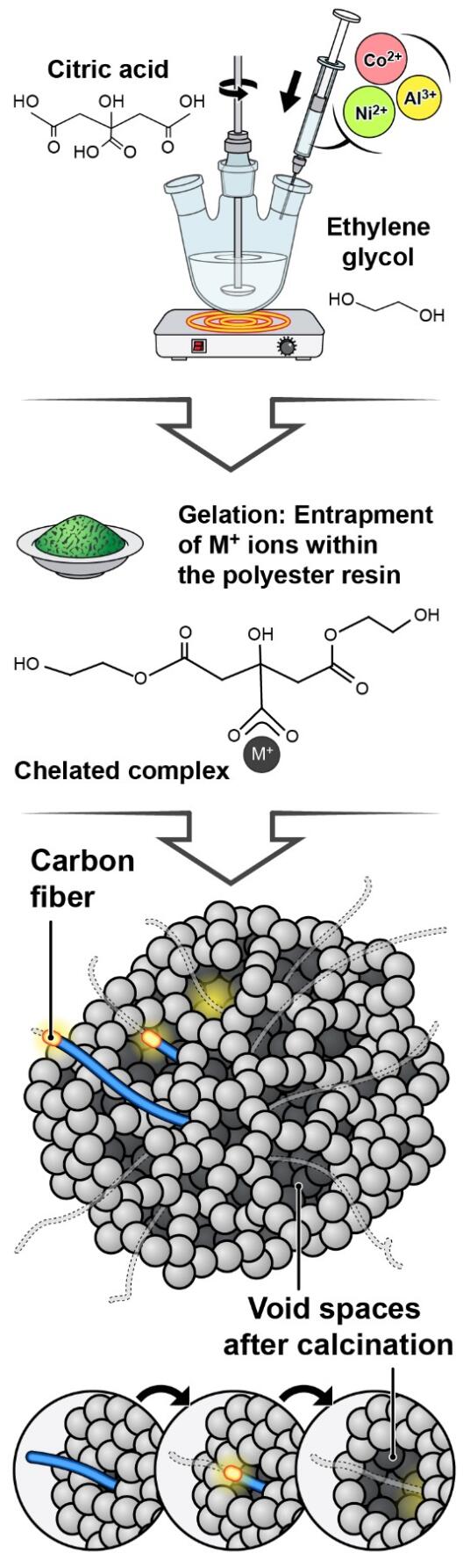 Das neu entwickelte Vorgehen basiert auf der Synthese mittels einer auf Kohlenstofffasern (CF) basierenden Vorlage durch eine modifizierte Pechini-Methode. Dieses Syntheseverfahren für hochhomogene Oxidmaterialien ermöglicht es, das Aluminium homogen in die NCA-Vorläuferstruktur zu integrieren und gleichzeitig die Partikelmorphologie anpassen zu können. „Indem wir die Partikel mit der CF-Vorlage synthetisieren, entstehen anisotrope Oberflächen, deren physikalische, mechanische und chemische Eigenschaften richtungsabhängig sind. Diese erleichtern nicht nur den Ionentransport innerhalb der Zelle, sondern stabilisieren Kathodenmaterialien auch für den Betrieb bei hohen Zellspannungen und Temperaturen“, erklärt MEET Wissenschaftlerin Dr. Aurora Gómez Martín.