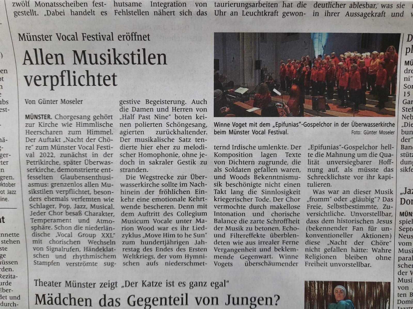 Am 22. September 2022 nahm der Madrigalchor mit "Move Him Into the Sun" am Chorfestival "Nacht der Chöre" in der Überwasserkirche teil.