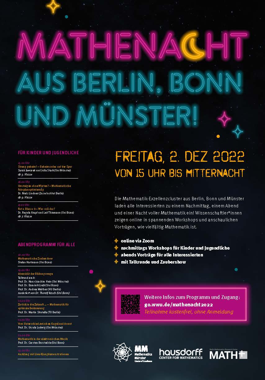 Wissenschaftler:innen der Mathematik-Exzellenzcluster MATH+ aus Berlin, Hausdorff Center for Mathematics der Uni Bonn und Mathematik Münster der Uni Münster zeigen in anschaulichen Workshops und Vorträgen, wie vielfältig und faszinierend Mathematik ist.