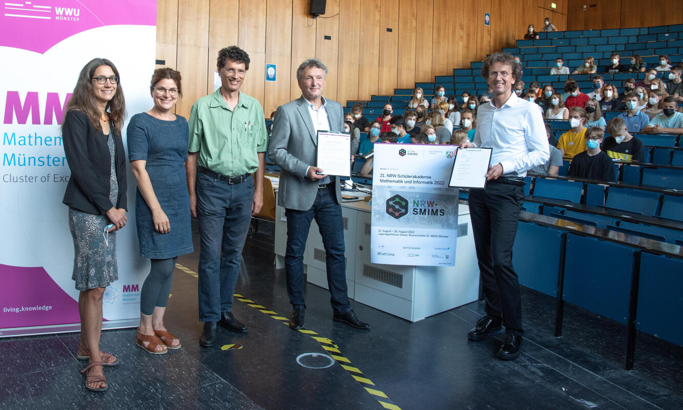 "Schon seit vielen Jahren engagieren sich Professorinnen und Professoren, Promovierende und Studierende unseres Fachbereichs für die SMIMS. Schön, dass diese Zusammenarbeit jetzt durch die Kooperationsvereinbarung noch enger wird", sagte Prof. Dr. Anne Remke. "Auf diese Weise möchten wir junge Talente fördern und sie zu einem Studium in der Mathematik oder Informatik ermutigen", ergänzte Prof. Dr. Mario Ohlberger, Sprecher des Exzellenzclusters Mathematik Münster.