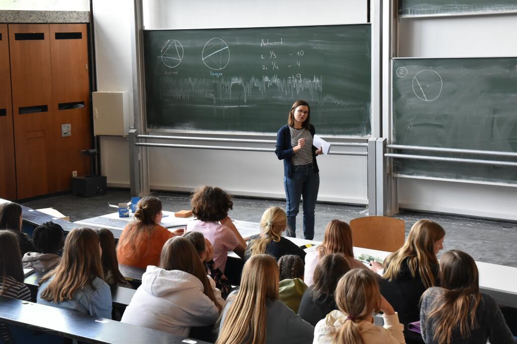 Beim Mittagessen in der Mensa am Ring konnten sich die Mädchen wie richtige Studentinnen fühlen. Danach ging es mit einer Schnuppervorlesung weiter. In einem echten Hörsaal hörten die Teilnehmerinnen die Vorlesung "Bertrand-Paradoxon: Ein Problem aus der stochastischen Geometrie mit drei Lösungen" von Juniorprofessorin Dr. Anna Gusakova.