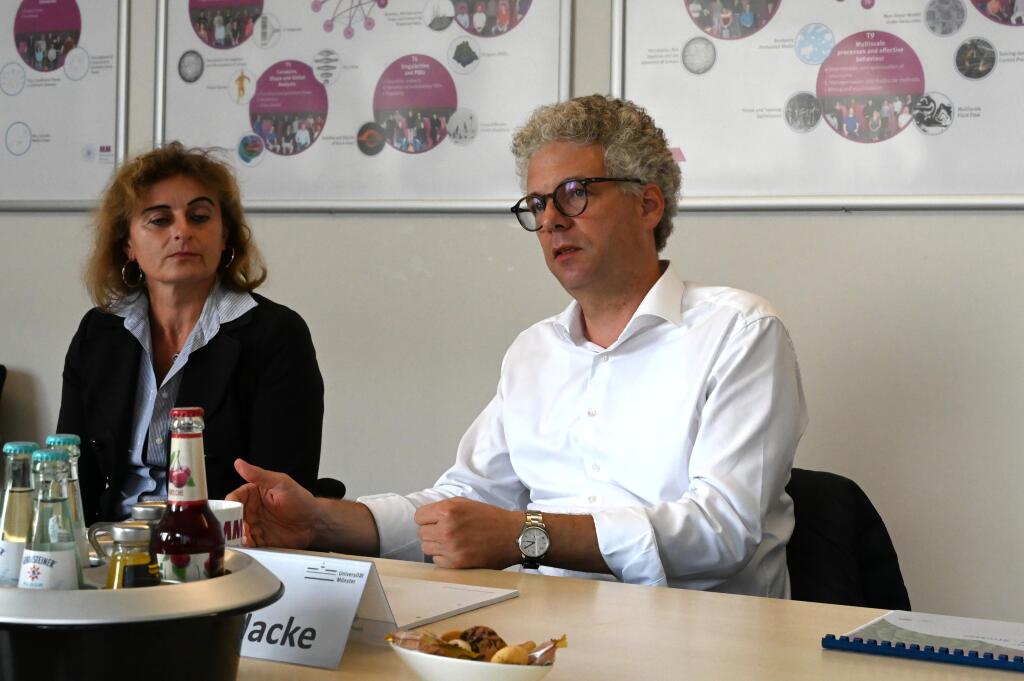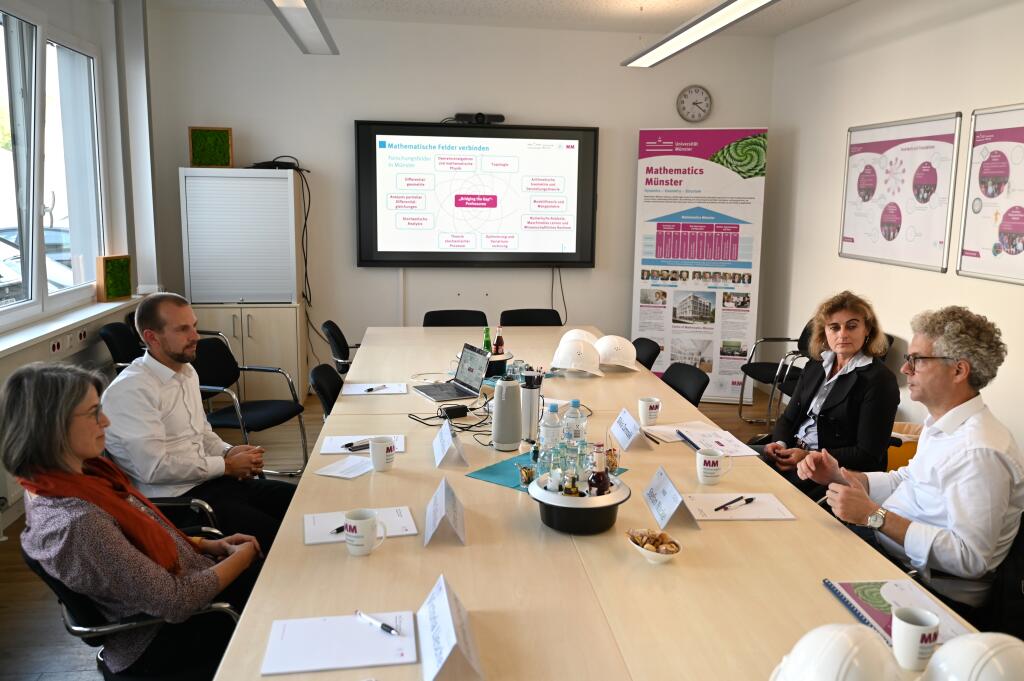 Last week, two members of the German Bundestag visited our Cluster of Excellence Mathematics Münster. Dr. Stefan Nacke (CDU) and Svenja Schulze (SPD) gained insights into the structure and work of the Cluster and learned more about our plans for the second funding period, which will begin on 1 January 2026.