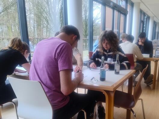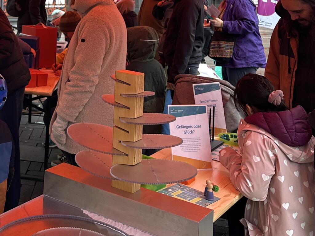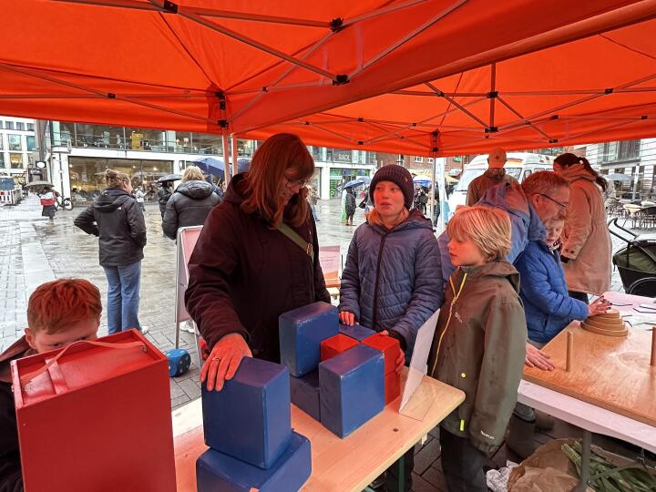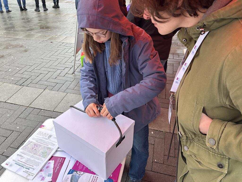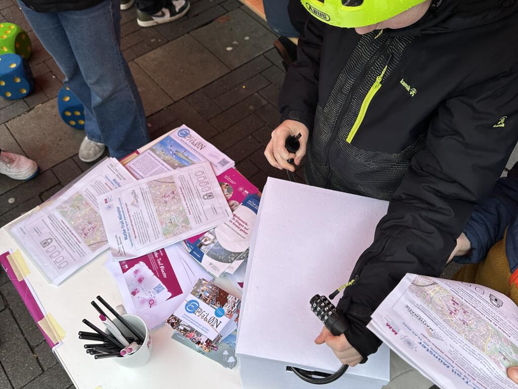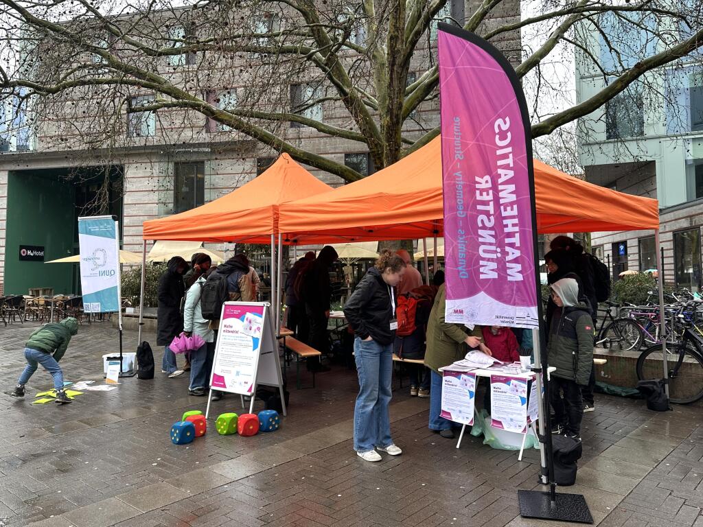 Trotz Regen und Kälte haben sich am 14.03.2026 viele Familien auf den Weg gemacht zu unserem Aktionsstand "Mathe mittendrin!" an der Stubengasse, mitten in Münster. Mit großer Ausdauer beschäftigten sich ältere Kinder mit den Knobelaufgaben von vier Rätselstationen des "Mathe-Trail Münster", die wir für die Aktion ausgewählt hatten. Wer den Lösungscode in das Schloss der "Schatztruhe" eingab, konnte sich einen kleines mathematisches Spielzeug aussuchen.
