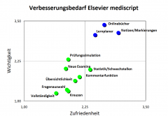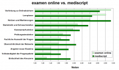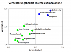 Bei examen online sind die drei Features Webseite übersichtlich, Fragenkommentare und Fragen nach Fachgebieten eine höhere Wichtigkeit als Zufriedenheit auf, werden also kritisch gesehen, d.h. sollten kurzfristig verbessern werden. Dies gilt auch für die Nutzbarkeit unterwegs.