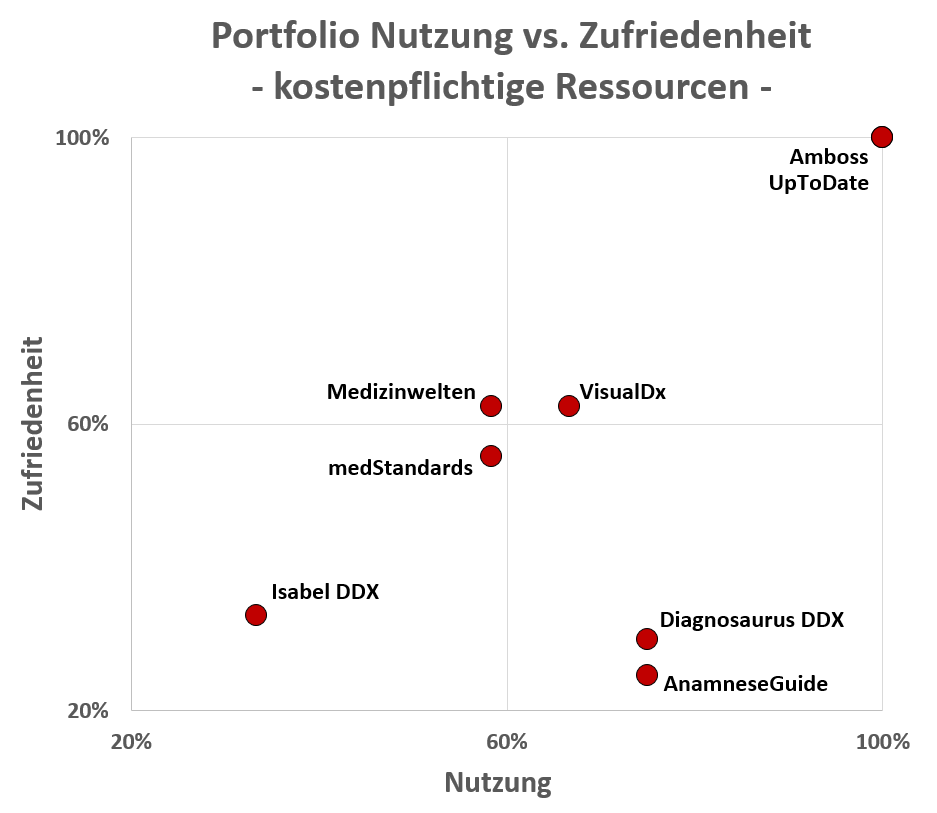 Mit Amboss und UpToDate gehören zwei Ressourcen unzweifelhaft zu den so genannten „Cash Cows“ im Quadranten rechts oben. Sie weisen eine 100% Nutzung bei 100% Zufriedenheit auf und werden auf jeden Fall weiter lizenziert und beworben.