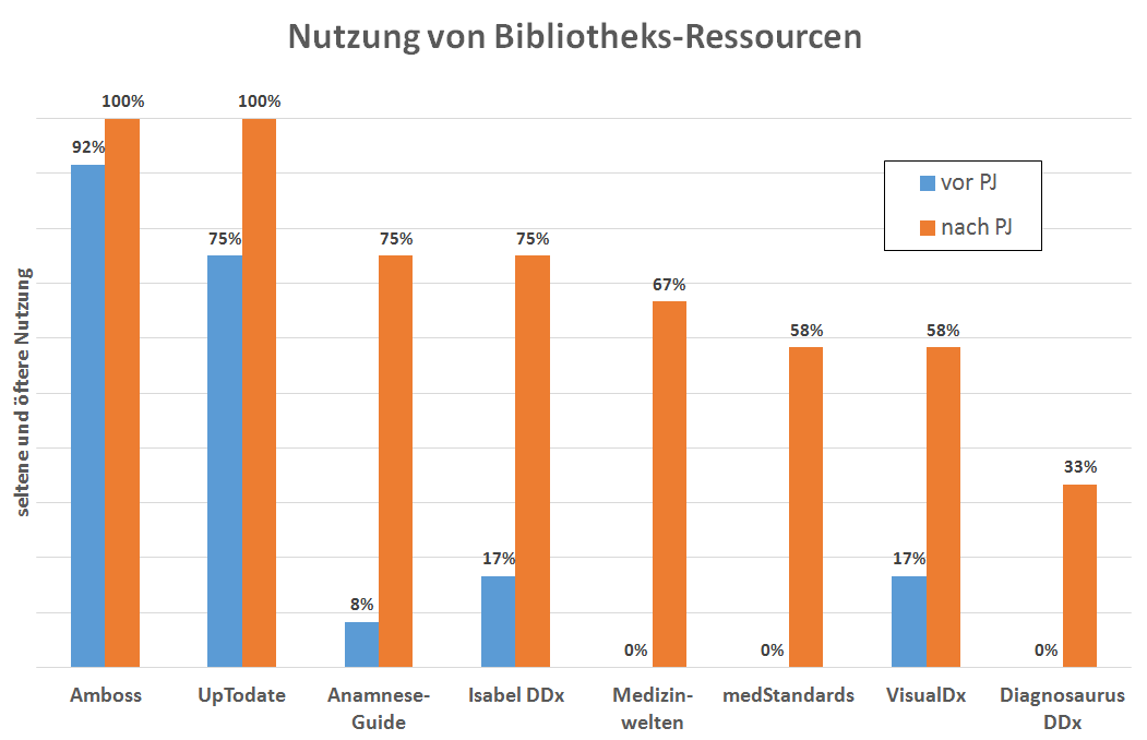 Die Teilnehmern wurden nach ihrer Nutzung der neun kostenpflichtigen Ressourcen gefragt. Nutzung und Bekanntsheitsgrad der Ressourcen konnten auf einer Viererskala angegeben werden (öfters – seltener – nicht benutzt – nicht bekannt). Für die obige Abbildung wurde die öftere und die seltenere Nutzung zusammengezählt. Es wurden zwei Umfragen durchgeführt: eine vor dem PJ und eine nach dem PJ. Während vor dem PJ nur Amboss und UpToDate von mehr als 17% benutzt wurden, kamen alle Ressourcen während des PJ auf Nutzungsraten größer 33% – ein Erfolg von Bewerbung und Zugänglichkeit.