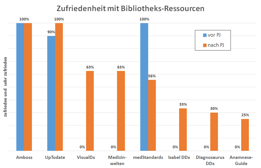 Die Teilnehmer konnten auf einer fünfteiligen Skala (sehr zufrieden, zufrieden, teils/teils, unzufrieden, sehr unzufriden) angeben, wie zufrieden sie mit den Ressourcen gewesen waren. Als Maß der Zufriedenheit wurden dann die Werte für sehr zufrieden und zufrieden zusammengezählt. Zu 100% zufrieden waren die PJler mit Amboss und UpToDate. VisualDx, Medizinwelten und medStandards folgten mit 63% resp. 56% als Trio auf den weiteren drei Plätzen. Die letzten drei Bibliotheks-Ressourcen Isabel DDx, Diagnosaurus DDx und Anamneseguide landeten mit einer Zufriedenheit von 25% bis 33% deutlich abgeschlagen auf den letzten Plätzen.
