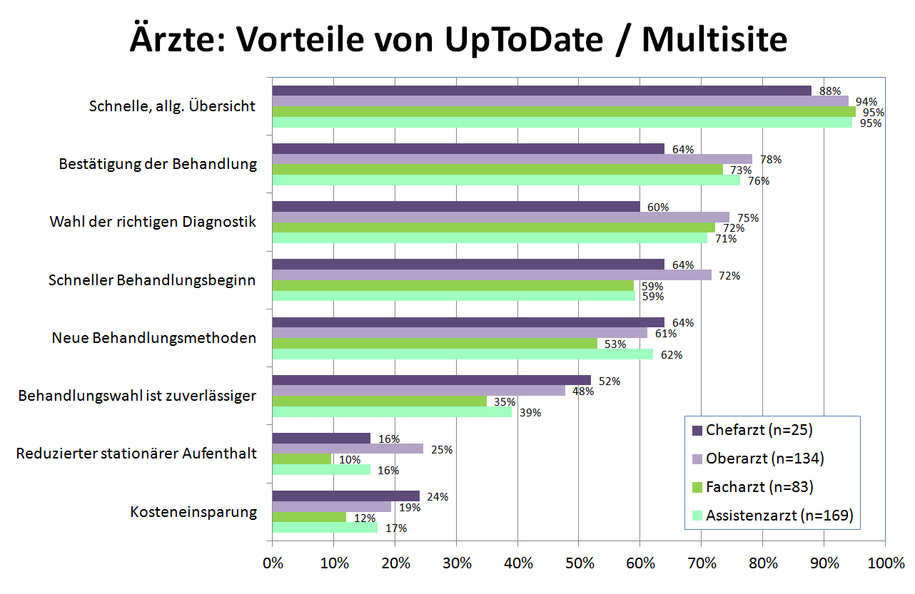 Obwohl UpToDate als Hilfe beim Point-of-Care beworben wird, standen doch nicht Behandlung und Diagnose an der Spitze der Vorteilsskala, sondern sich einfach einmal einen schnellen, allgemeinen Überblick über Erkrankungen und klinischen Fragen zu verschaffen. Hier stimmten die vier Ärztegrade Assistenz-, Fach-, Ober- und Chefarzt sehr eng miteinander überein, die Zustimmung varierte nur wenig von 90-100%.
