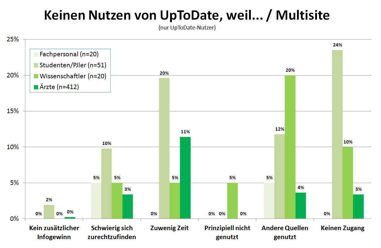 Interessanterweise beklagten dreimal mehr Ärzte als in Münster, sie hätten keinen Zugang zu UpToDate gehabt und jeder zehnte Wissenschaftler (in Münster kein einziger). Auch die Studenten/PJler (jeder Vierte) hatten es deutlich schwerer, an UpTodate heranzukommen als die Münsteraner (jeder Siebte).