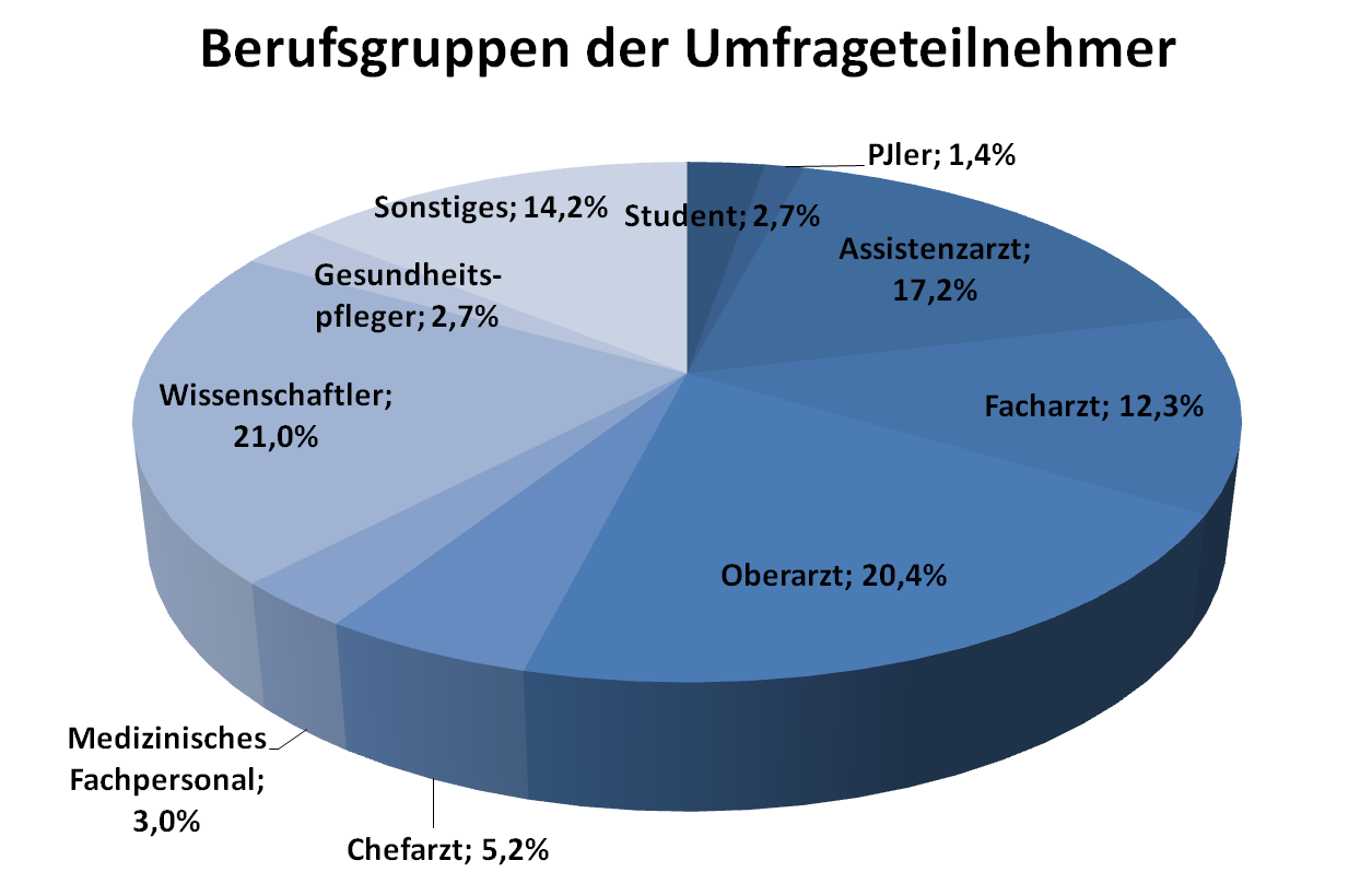 In der Frage2 wurde nach dem beruflichen Status der Antwortenden gefragt. 4,1% waren Studierende oder PJler, 55,1% Assistenz-, Fach-, Ober- oder Chefärzte*, 3% medizinisches Fachpersonal, 21% Wissenschaftler, 2,7% Gesundheits- und Krankenpfleger und 14,2% gehörten sonstigen Berufsgruppen an (Alumni, Doktorand, Emeritus, Geschäftsführer, Logopäde, Psychologe, Sekretärin usw.).