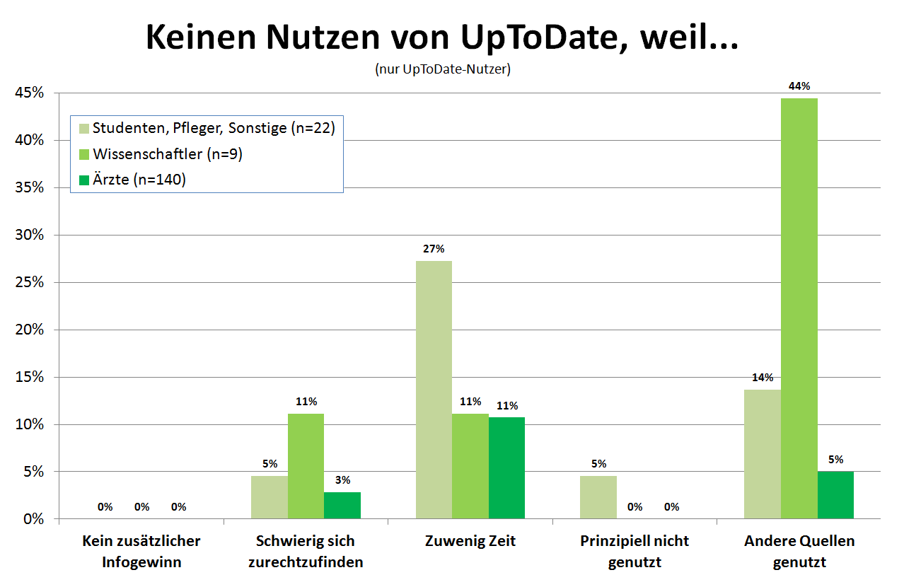 Bricht man die obige Fragestellung auf diejenigen Umfrageteilnehmer herunter, die angaben, UpToDate auch wirklich genutzt zu haben, verschiebt sich das Bild deutlich: Es gibt keinen Antwortenden mehr, der nicht einen Informationsgewinn durch UpToDate hatte; wesentlich mehr (aber nur 4 Ärzte) fanden es nun schwierig sich dort zurechtzufinden (insb. die Wissenschaftler wurden dadurch abgeschreckt); 27% statt 8% der Sonstigen hatten auf einmal keine Zeit (durch den Filter „UpToDate-Nutzung waren jetzt offensichtlich die klinisch Tätigen selektiert worden); nur ein Einziger hatte es prinzipiell dann doch wieder nicht genutzt; unter den wiss. UpToDate-Nutzern hatte 44% (und damit fast doppelt so viele) auch andere Datenbanken genutzt (eine Selektion auf Recherche freudige Wissenschaftler?), bei den Ärzten war es genau andersherum: hier hatte sich die Quote auf 5% fast halbiert (weil die UpToDate-Nutzer so zufrieden waren, dass sie keine anderen Quellen mehr brauchten?); und die – nun unlogische – Antwort der UpToDate-Nutzer, sie hätten „keinen Zugang“, nannten immerhin noch 3 Sonstige, aber nur noch 2 Ärzte und kein Wissenschaftler.