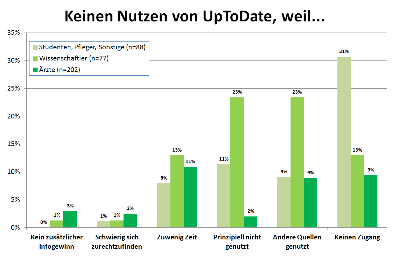 Weniger als 2% der Antwortenden gaben an, keinen zusätzlichen Informationsgewinn durch UpTodate gehabt oder sich nicht in UpToDate zurecht gefunden zu haben – ein bemerkenswert gutes Zeugnis für die Nutzbarkeit des Point-of-Care-(POC)-Tools. Schwerer wog da schon die Zeitknappheit, die 10,6% davon abhielt, einen Nutzen von UpToDate zu konstatieren. Fast ein Viertel aller Wissenschaftler (23%) und jeder Neunte Sonstige (11%) nutzen aus prinzipiellen Erwägungen UpToDate nicht, vermutlich, da sie nicht klinisch tätig waren, wie z.B. etliche Verwaltungsangestellte. Wissenschaftler nutzten natürlich eher andere Informationsquellen (23%), als die Ärzte oder Sonstige (je 9%). Überraschend war die Anzahl derjenigen, die angaben, keinen Zugang zu UpToDate gehabt zu haben, bestand für UpToDate doch eine uniweite Campuslizenz. Insbesondere die Sonstigen taten sich hier mit 31% Unkenntnis hervor, doch auch 13% der Wissenschaftler und jeder Elfte Arzt klagte darüber, keinen Zugang zu UpToDate gehabt zu haben.