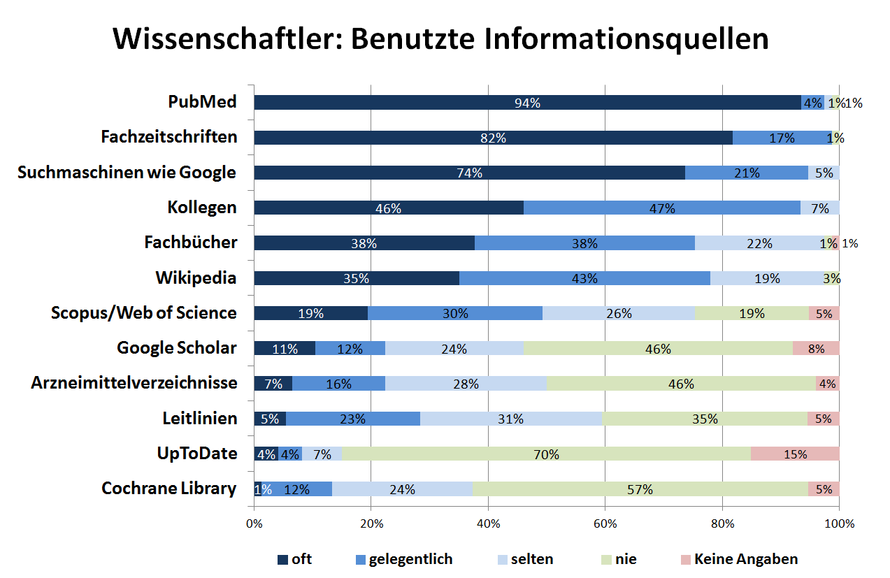PubMed ist die mit Abstand von den meisten am häufigsten genutzte Informationsquelle. 94% benutzten PubMed oft, lediglich 2% selten oder nie. Auf Platz 2 folgend die Fachzeitschriften mit 82% mit der Besonderheit, dass keiner diese nie benutzte. Mit Suchmaschinen wie Google und Wikipedia sind zwei – nicht peer reviewte – Internetquellen auf Platz 3 und 6 prominent vertreten. Internetsuchmaschinen haben die Besonderheit, dass sie als einzige Informationsquelle (die Kollegen ausgenommen) von jedem, wirklich jedem benutzt wurden. Die Forscherkollegen fallen gegenüber den ersten drei am häufigsten genutzten Quellen schon deutlich ab: Nur 46% konsultierten ihre Kollegen oft, aber immerhin 47% gelegentlich, so dass in der Summe 93% diese „Informationsquelle“ eben nicht selten nutzten – doch wieder ein Spitzenwert.