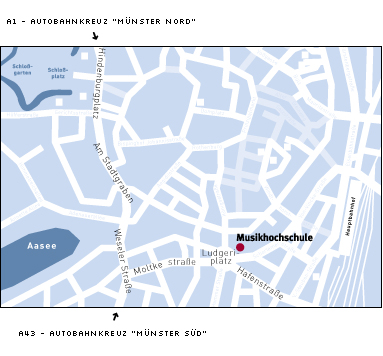 Zahlreiche Buslinien fahren direkt zu den Haltestellen „Ludgeriplatz“. Von hier sind es nur wenige Schritte in den Konzertsaal der Musikhochschule. Elektronischen Fahrplanauskunft der Stadtwerke Münster Vom Hauptbahnhof Münster aus erreichen Sie die Musikhochschule in 2 Minuten per Bus oder in ca. 5 Gehminuten.