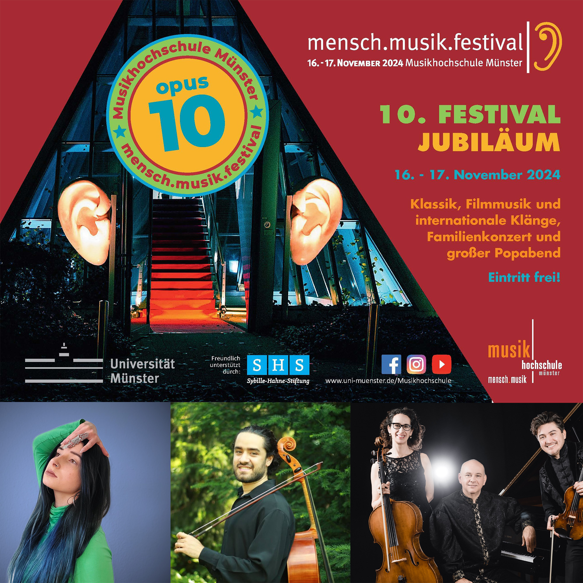 Das mensch.musik.festival der Musikhochschule Münster feiert 2024 sein 10-jähriges Jubiläum mit 10 Konzerten! Am 16. und 17. November, von Samstagmittag bis Sonntagabend, werden die Festival-Themen der ersten 9 Festival-Jahre noch einmal anklingen, ein Kinderkonzert ergänzt das Programm am Sonntagmittag. Feste Instanz: Der legendäre Samstagabend der Popabteilung, dieses Mal mit fünf Acts.