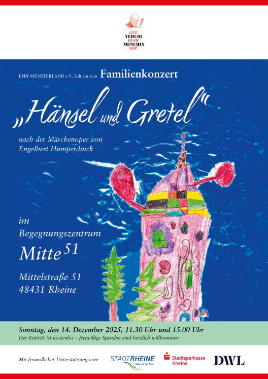 Die Stipendiat*innen des Live Music Now Münsterland e.V. laden am Sonntag, den 14. Dezember, um 11:30 Uhr und um 15:00 Uhr zu zwei Vorstellungen des Familienkonzerts Hänsel und Gretel ins Begegnungszentrum Mitte51 in Rheine ein. Nach einer Märchenoper von Engelbert Humperdinck, erzählt Thorsten Bönning mit musikalischer Begleitung der Stipendiat*innen unter der Leitung von Prof. Werner Raabe die Geschichte von Hänsel und Gretel. Der Eintritt ist frei, Spenden zu Gunsten des LMN Münsterland e.V. sind willkommen.