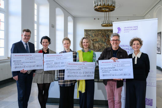 In 2026, the University Society of Münster is funding a total of 15 projects across all departments in the areas of research, teaching, culture, and student engagement. On March 30, 2026, the symbolic check presentation took place at the castle. The board of the University Society and the university president presented the project leaders and representatives with their checks and warmly congratulated them on receiving the funding. Following this, all grant recipients briefly presented their projects. Four projects from the University of Music are once again receiving generous support this year: the Fürstenau Flute Competition, which is currently in the planning phase; the opera project; the internal university competition; and the Klangzeit__Werkstatt. We extend our heartfelt thanks for this support!