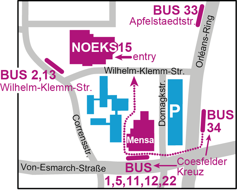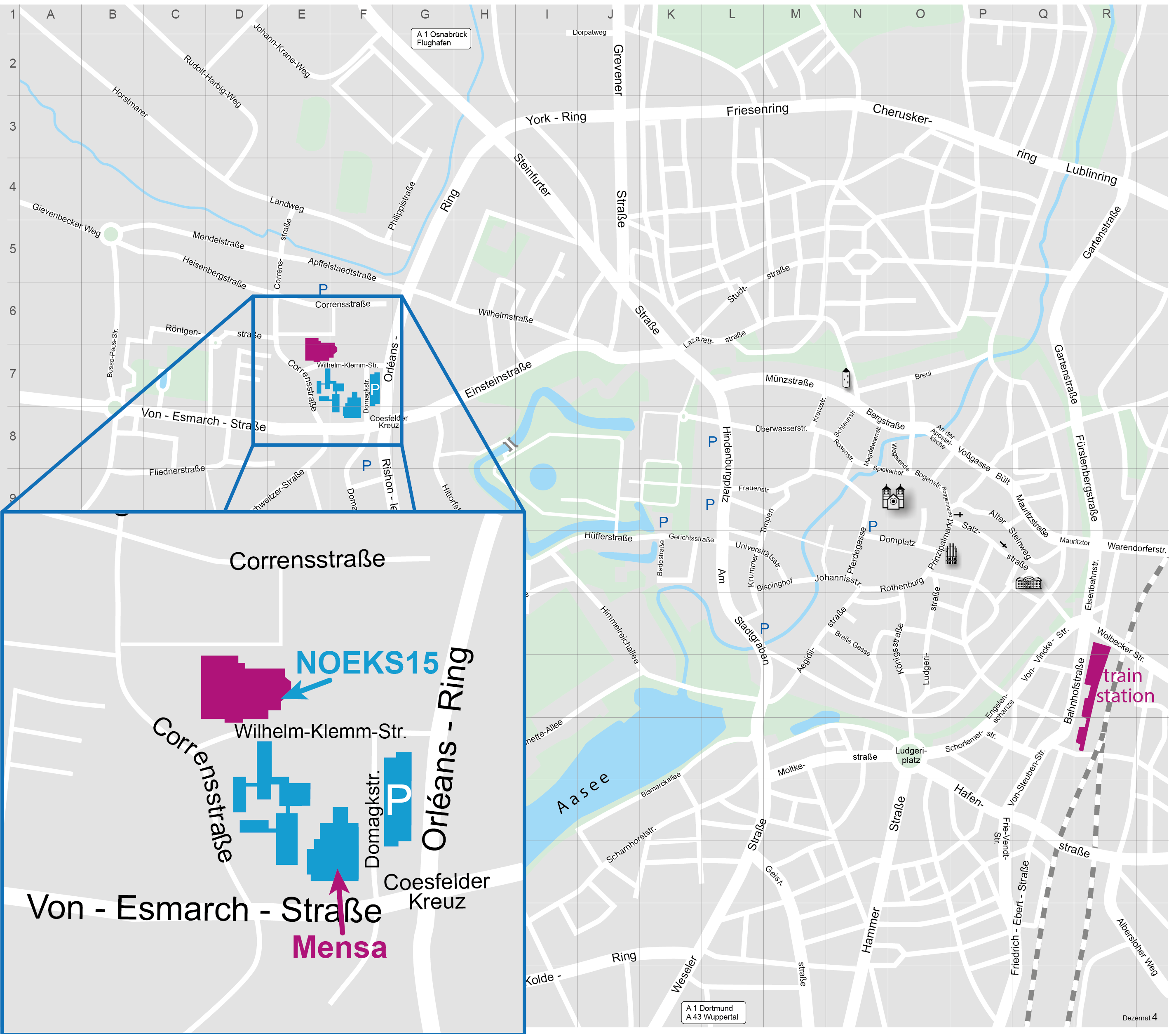 A number of hotel rooms has been reserved for the conference and can be found here. Please make sure to use the code "NOEKS" when booking to get the best price.Additional rooms or appartments my be found here or with hotel booking sites.Please note that all registered participants of NOEKS will receive a complimentary ticket for public transport in Münster during the conference.
