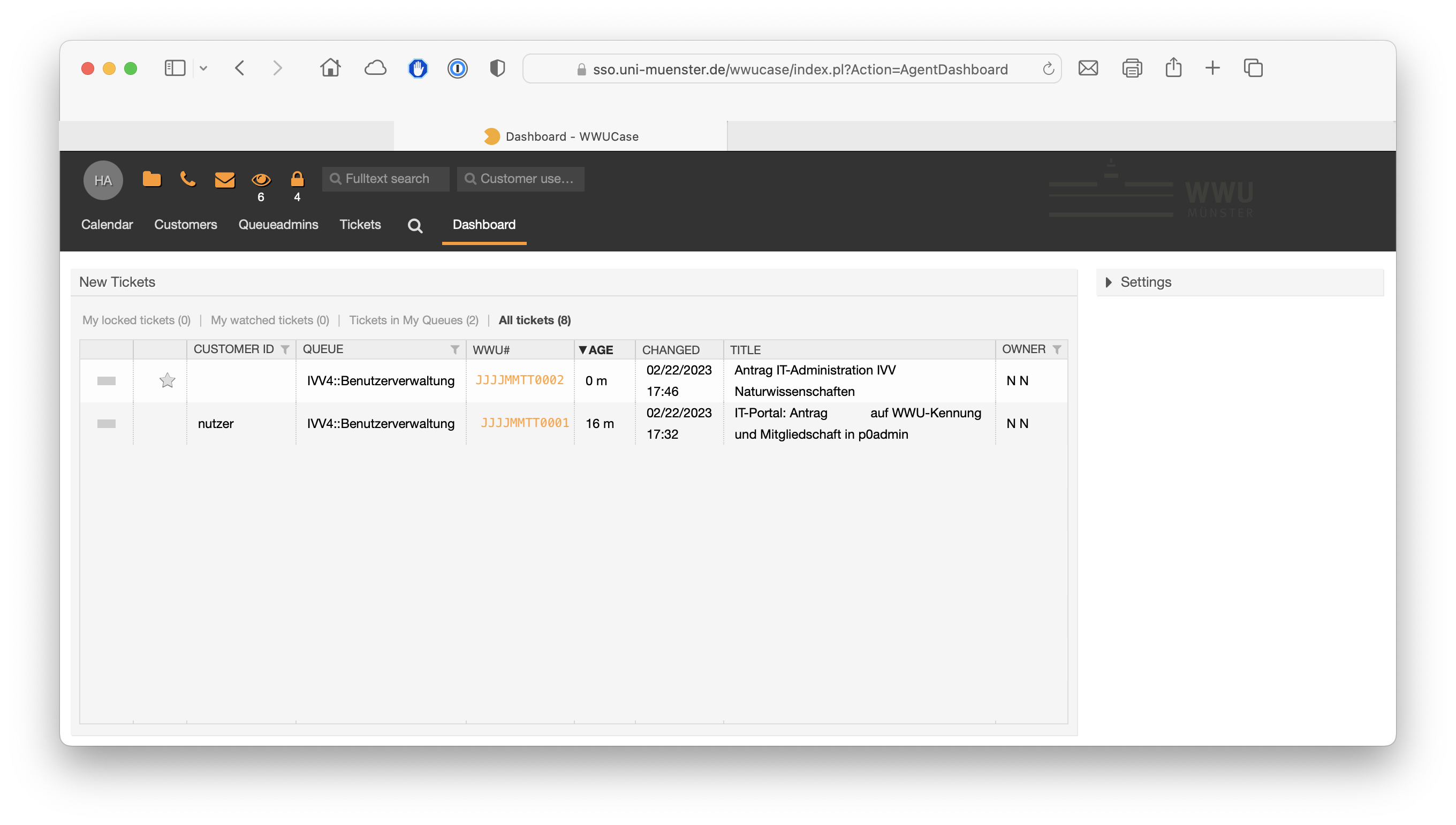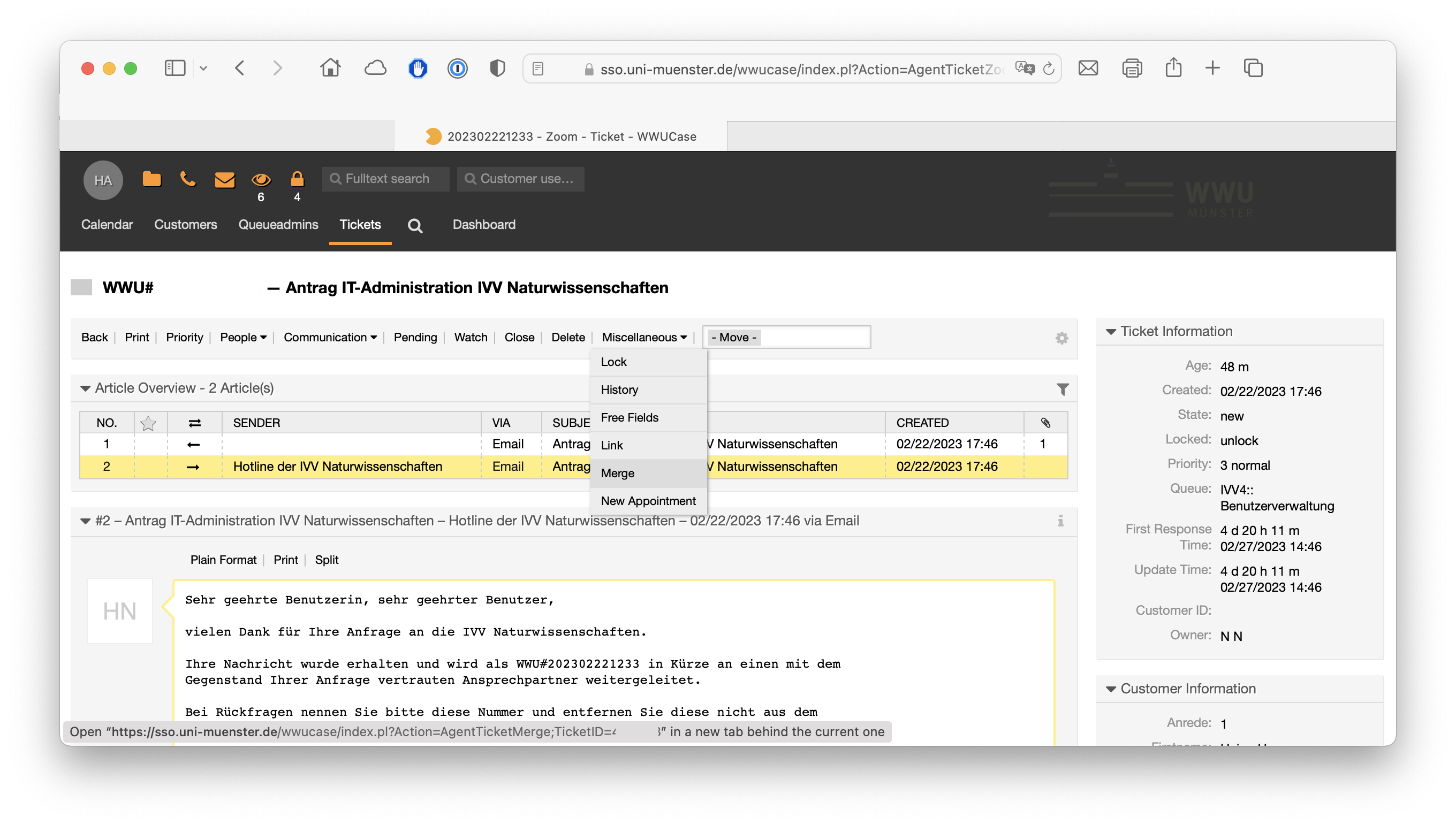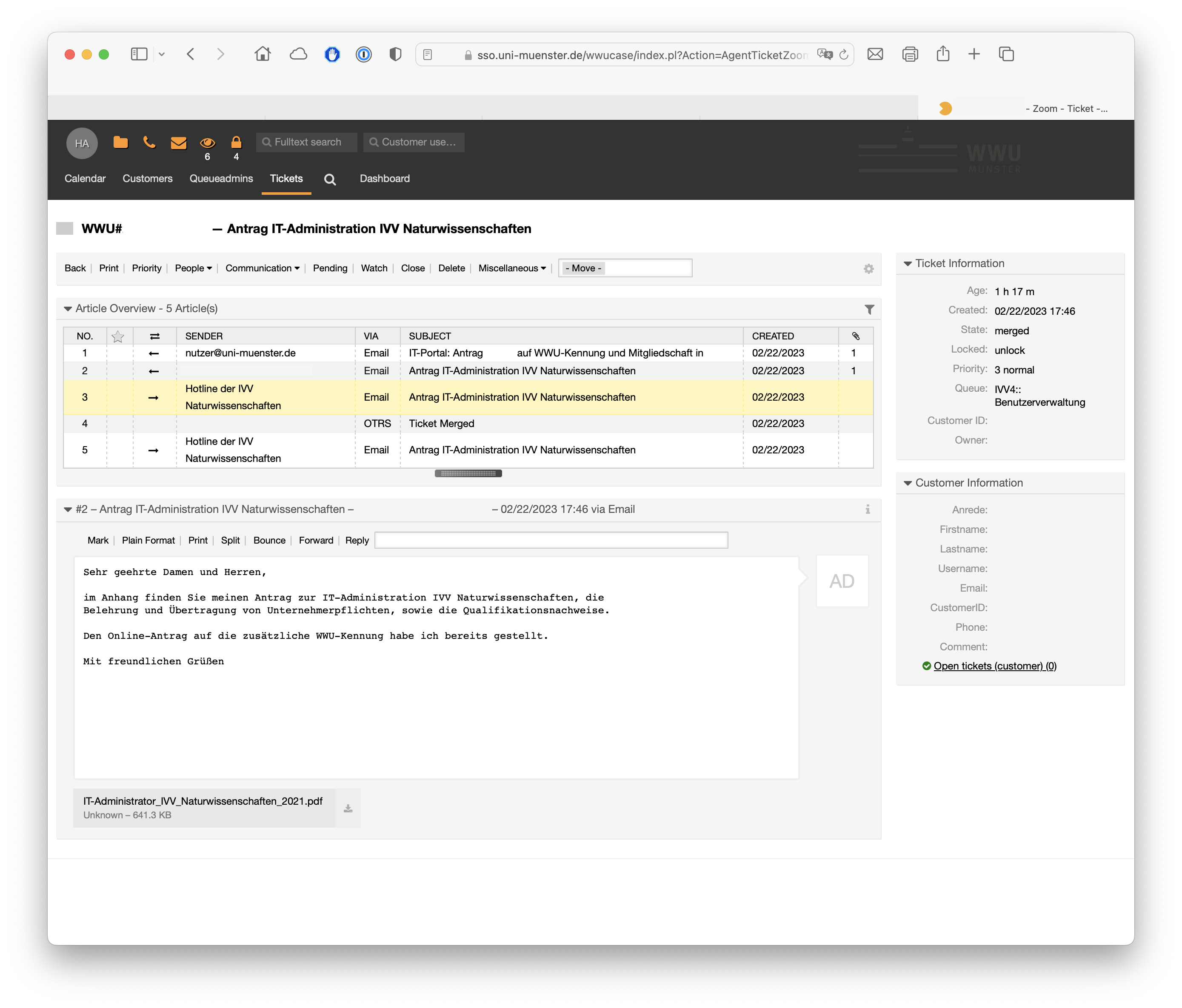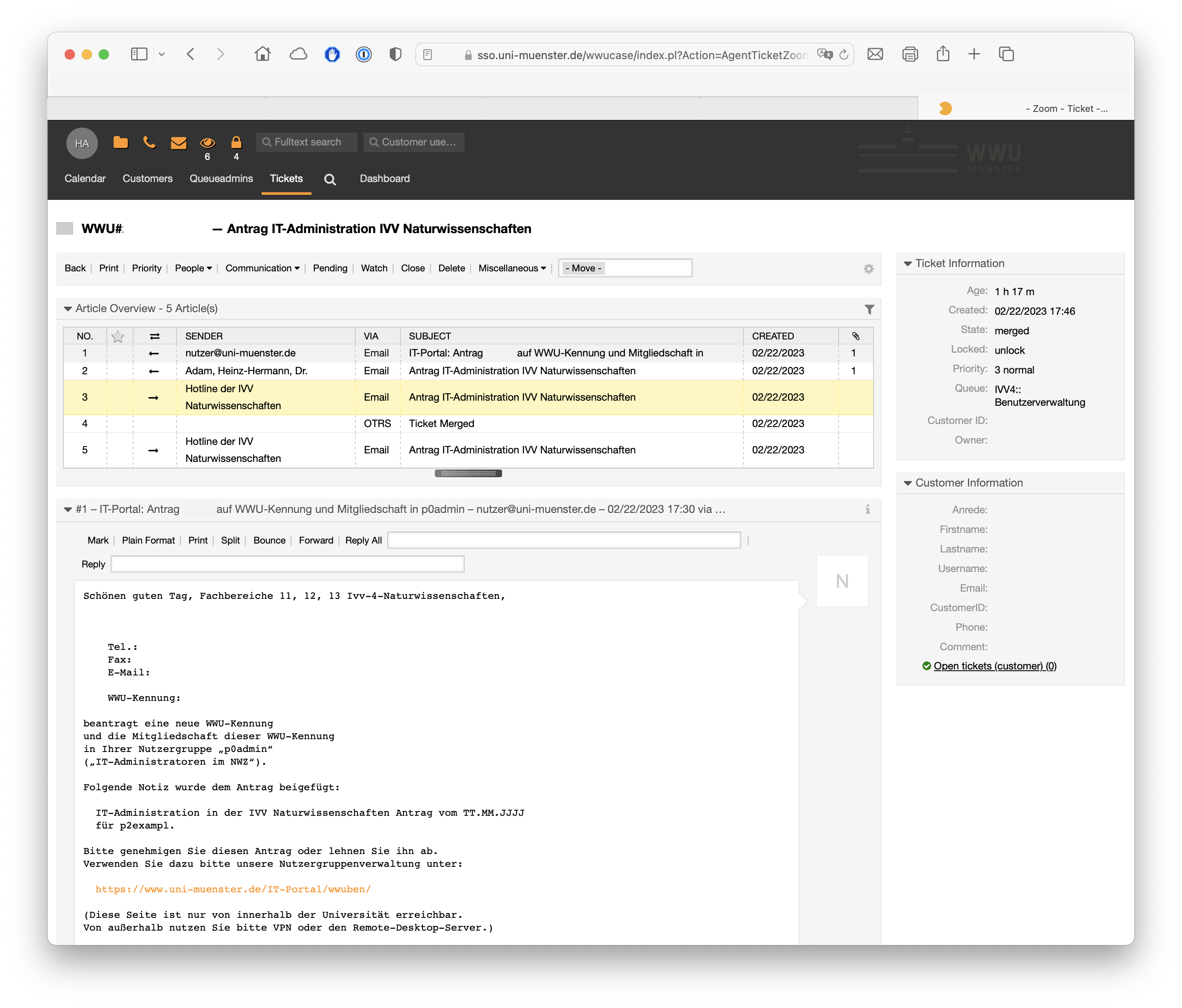 Dort können die beiden Tickets (IT-Portal Antrag für p0admin, IT-Administration IVV Naturwissenschaften Antrag mit Anlagen) zusammengefasst werden. Dazu merken Sie sich die WWU# des Tickets "Antrag IT-Administration IVV Naturwissenschaften", im Beispiel: JJJJMMTT0002 und öffnen das Ticket mit dem "IT-Portal: Antrag ...".