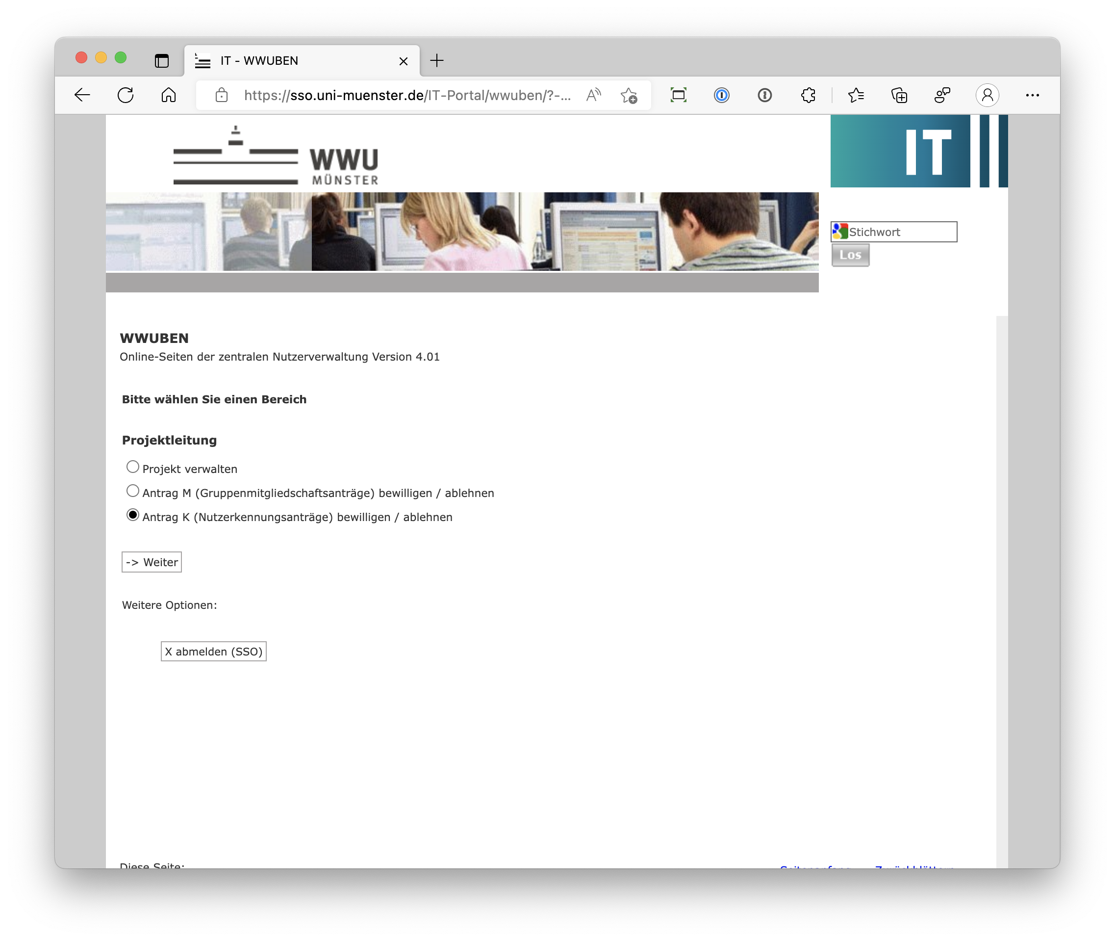 In der Email mit dem Antrag finden Sie den Link um die WWUben zur Bewilligung oder Ablehnung eines Antrags K aufzurufen, z.Zt. https://www.uni-muenster.de/IT-Portal/wwuben/. Öffnen Sie diesen im Browser.