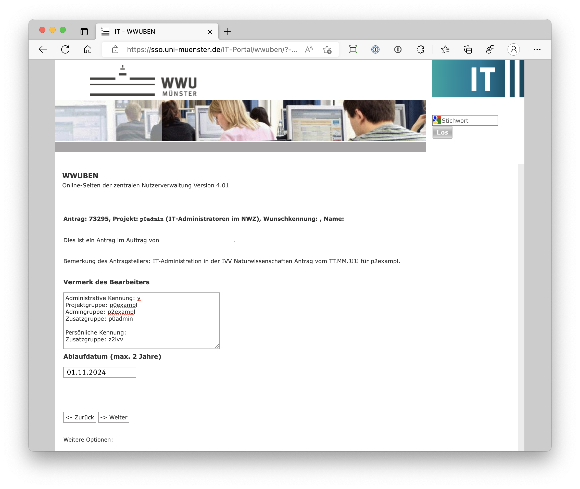 Admingruppe: p/q/r/s/x2... (korrespondierend zur Projektgruppe, von dieser Gruppe ist die IVV Projektleiterin. Sollte die Gruppe noch nicht existieren, muss sie vom Identitätsmanagement gemäß der Bearbeitungshinweise auf dem Antrag "IT-Administrator IVV Naturwissenschaften" angelegt werden.)