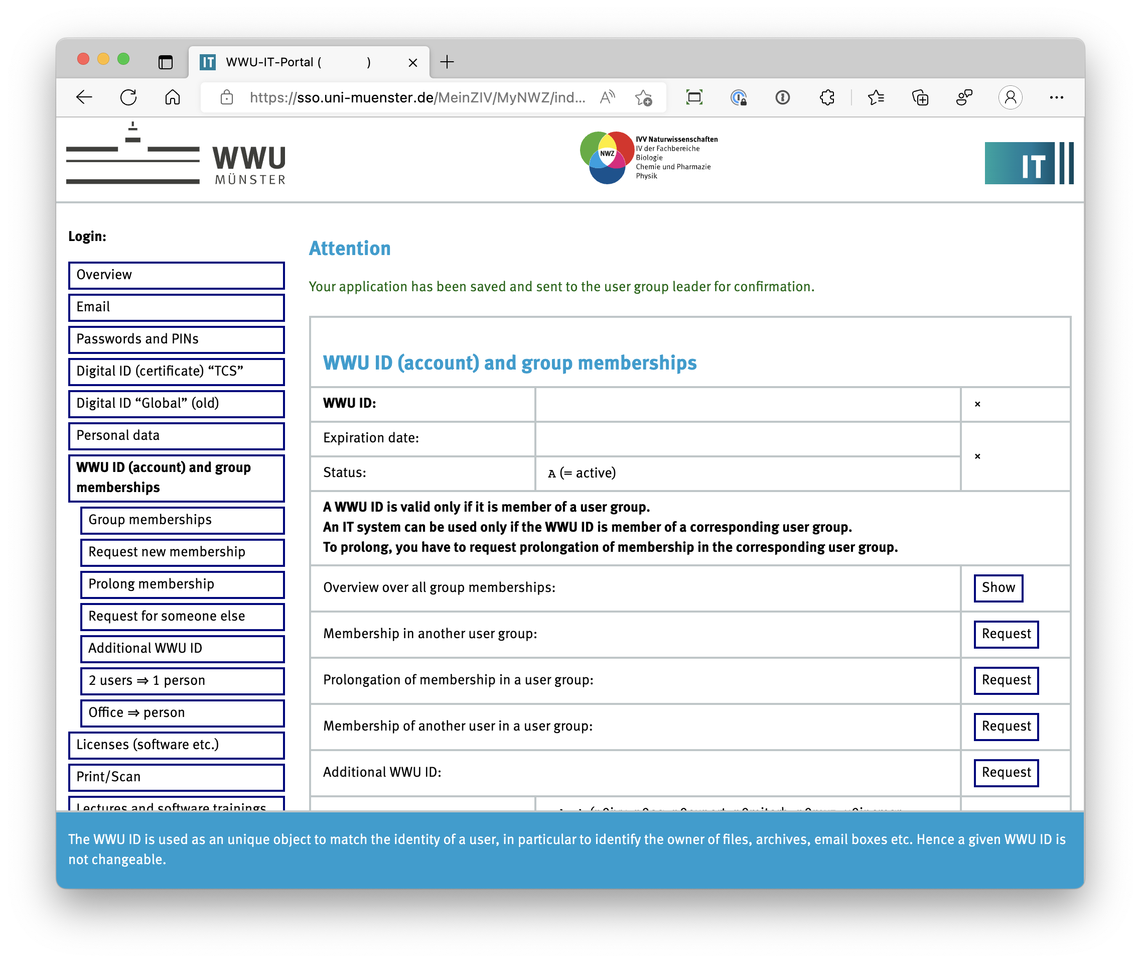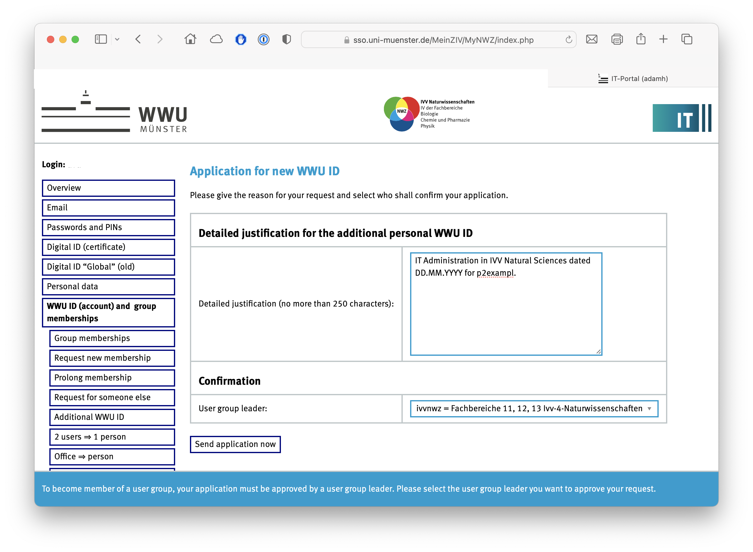 Under "Detailed justification (no more than 250 characters)", make reference to the "IT Administration in IVV Natural Sciences" application you sent to the IVV Hotline, e.g.: