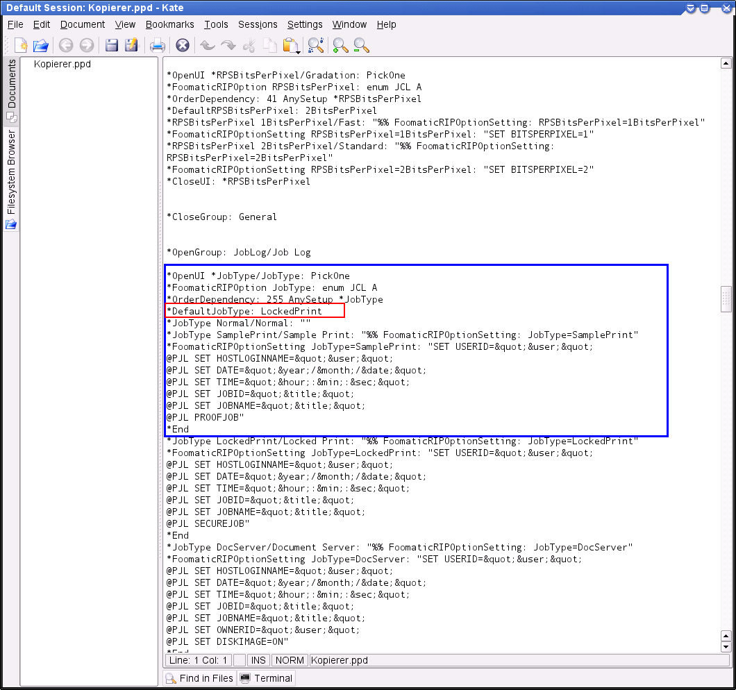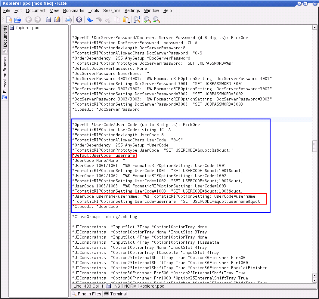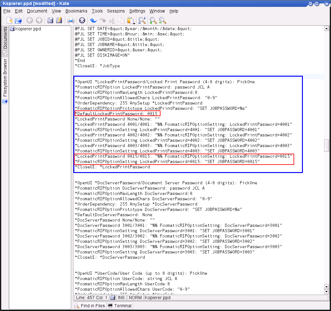 and in addition to the three options for selecting the user code (1001, 1002, and 1003) and the PIN (4001, 4002, and 4003), which are not very difficult to guess, you have to open the corresponding PPD file from the directory /etc/cups/ppd/ in an editor.