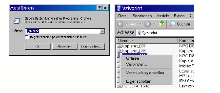 One-time: With Start -> Run -> Enter: \\zivprint you get a list of the printers managed by the WWU IT. The multifunction devices are called „Kopierer_#“, "#" stands for the consecutive number of the respective multifunction device. Please ask for the number of the desired multifunction device the person responsible for the device in the respective area. Select the desired printer with the mouse and "connect" using the right mouse button. The window with the printers can now be closed.