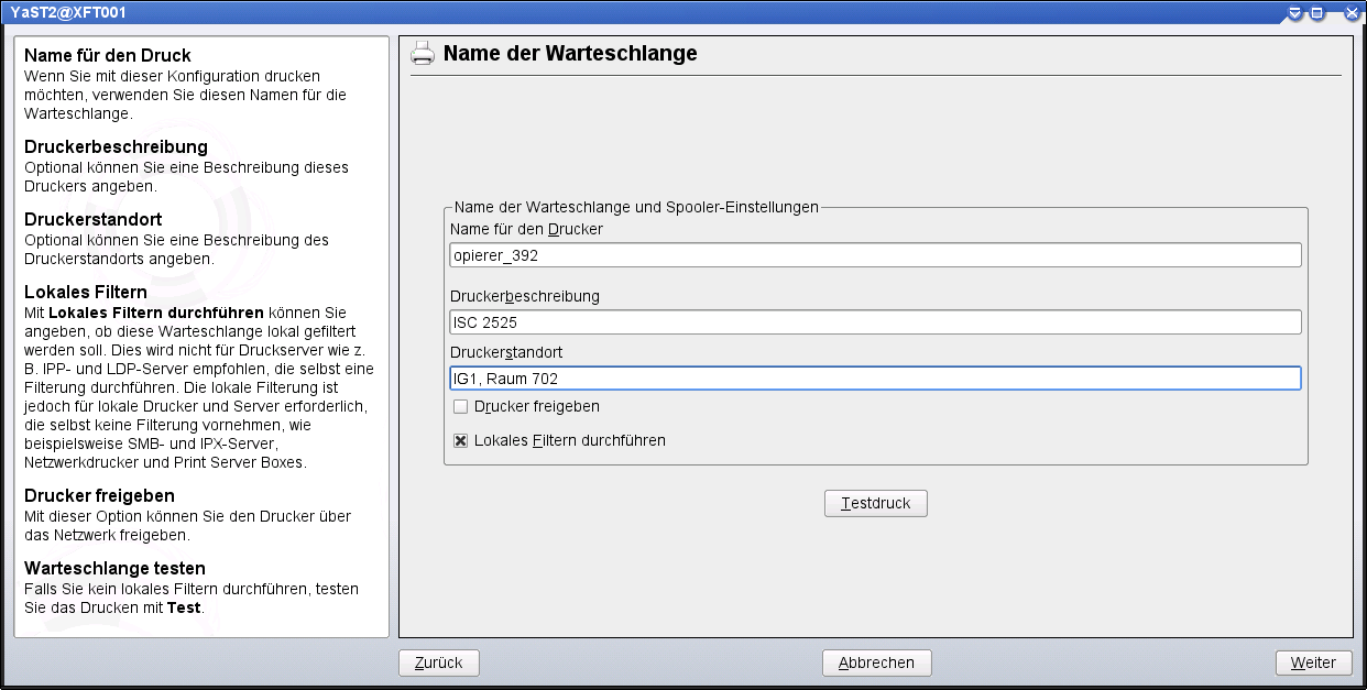 Name is automatically entered (why the K is missing remains a mystery...), enter printer description and location, deselect "Share printer". Next.