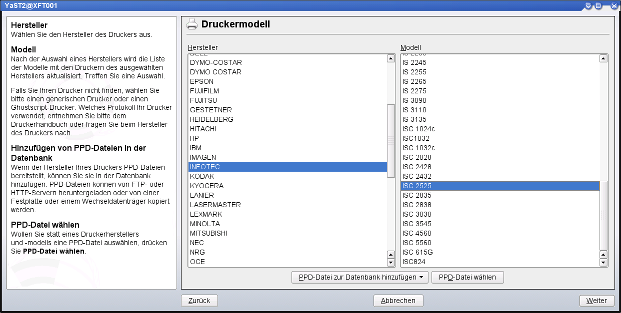 Enter the type of the respective device in the filter, e.g. "ISC 2525", click on "Apply". Select the appropriate driver from the list, e.g. "Infotec ISC 2525 PXL Foomatic/pxlmono (recommended) (...)". "Next".
