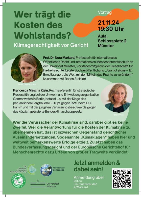 Im Rahmen der Veranstaltungsreihe "Klimastress und Klimagerechtigkeit" findet am 21.11.24 um 19.30 Uhr in der Aula des Schlosses ein Vortrag zum Thema "Wer trägt die Kosten des Wohlstandes? - Klimagerechtigkeit vor Gericht" statt. Eine Veranstaltergemeinschaft aus dem Verein Together for future, dem Zentrum für interdisziplinäre Nachhaltigkeitsforschung der Universität Münster und dem Trägerkreis Münsteraner Klimagespräche lädt zu dieser kleinen Veranstaltungsreihe ein, die am 29.10.24 mit dem Vortrag "Und wir machen trotzdem weiter. Vom Hoffen und Kämpfen in Krisenzeiten" von Carla Reemtsma ihren Auftakt gefunden hat.