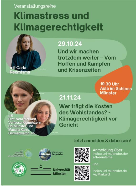 Eine Veranstaltergemeinschaft aus dem Verein Together for future, dem Zentrum für interdisziplinäre Nachhaltigkeitsforschung der Universität Münster und dem Trägerkreis Münsteraner Klimagespräche lädt zu einer kleinen Veranstaltungsreihe "Klimastress und Klimagerechtigkeit" ein. Beide Veranstaltungen finden in der Aula des Schlosses statt.