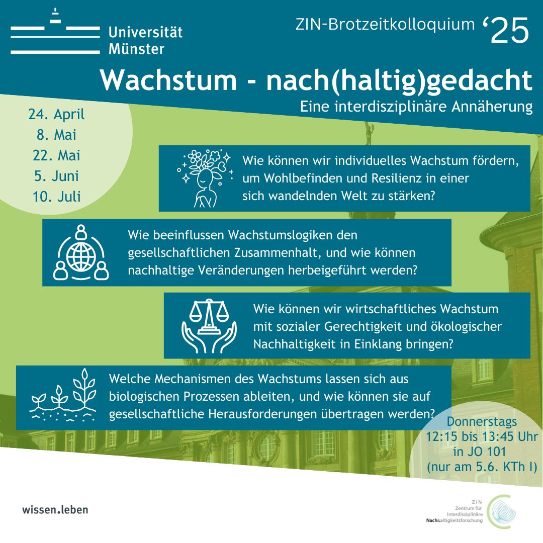 In cooperation with the Akademie Franz Hitze Haus, ZIN is organizing a conference on the topic of “Multidisciplinary perspectives on growth in the context of sustainability - on the exchange of social and natural science approaches”. The conference starts on Monday, May 12, 2025 at 1:30 pm and ends on Tuesday, May 13, 2025 at 3 pm. Registration is now open. | Read more