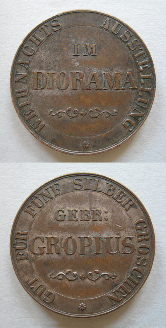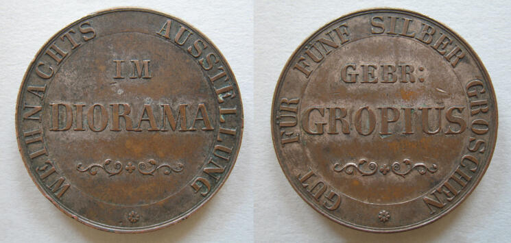 Die Art der Beschriftung kennzeichnet dieses Stück als eine Art Wertmarke. Ihr Wert beträgt 5 Silbergroschen (Sgr.), herausgegeben wurde sie von den Gebrüdern Gropius. Zugang bekam man für sie zur Weihnachtsausstellung im Diorama. Daher könnte man meinen, es handle sich um eine ›normale‹ wiederverwendbare Zugangs- oder Eintrittsmarke, die man an der Kasse des Dioramas der Gebrüder Gropius erwarb, das sich in Berlin befand, und dann am Eingang wieder abgab.