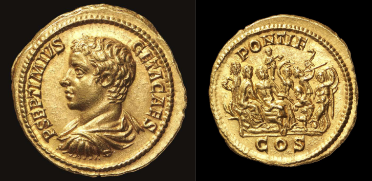 Ein Aureus des Geta Am 21. Juni 2017 öffnet im Israel Museum in Jerusalem eine numismatische Ausstellung mit 75 römischen Goldmünzen aus der Victor A. Adda Collection. Die Aurei stammen aus einer alten Sammlung und sind allesamt von höchster Qualität und vorzüglichem Erhaltungszustand, mehrere der Goldstücke Unikate. Unter den Münzen ist auch ein Aureus des Geta, der aufgrund seines außergewöhnlichen Themas auf der Rückseite auffällt (RIC IV.1, 318 Nr. 33). Das Stück wurde wohl 206 n. Chr. ausgegeben. Die Vorderseite zeigt die barhäuptige Büste des Geta nach links. Geta war der Sohn des Kaisers Septimius Severus und sein älterer Bruder war Caracalla. Die beiden Prinzen, Caracalla und Geta wurden von Septimius Severus als Nachfolger aufgebaut, beide regierten kurze Zeit nach dem Tod des Vaters 211 n. Chr. gemeinsam, bevor Caracalla seinen Bruder beseitigte und Alleinherrscher wurde.
