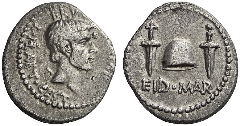 Diese Münze war schon in der Antike so bekannt und in ihrer Ikonographie und programmatischen Aussage so geläufig, dass noch drei Jahrhunderte später der Historiker Cassius Dio schreiben konnte: »Brutus (...) ließ auf den Münzen, die er prägte, sein Bildnis und eine Mütze sowie zwei Dolche darstellen und machte durch diese Bilder und die Inschrift deutlich, dass er mit Cassius das Vaterland befreit hatte« (Cass. Dio XLVII 25, 3). Eine Erinnerungsmünze an einen politischen Mord mit dem Porträt des M. Iunius Brutus, eines der Mörder, auf der Vorderseite: Mit dieser Währung, in einer mobilen Feldmünzstätte geprägt, bezahlte eben dieser Brutus Monate später seine Truppen in Makedonien, wo er im nach dem Tod Caesars neu aufgeflammten Bürgerkrieg zusammen mit anderen Republikanern gegen Marcus Antonius und den jungen Octavian, den späteren Augustus, kämpfte und 42 v. Chr. in der Schlacht bei Philippi unterliegen und Selbstmord begehen sollte.