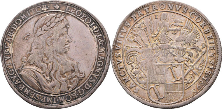 Das geharnischte Brustbild Kaiser Leopolds I. ist um den Lorbeerkranz des siegreichen Imperators ergänzt, der schon in der Antike ein Attribut des Kaisers war. Die Umschrift nennt seinen Titel LEOPOLD I & MAGNVS D[ei] G[ratia] ROM[anorum] IMP[erator] SEMP[er] AVG[ustus] TVRCAR[um] DOMITOR = Leopold der Erste und Große von Gottes Gnaden Kaiser der Römer, Allzeit Mehrer des Reiches, Bezwinger der Türken. Die letzte Formel gehörte nicht zur offiziellen kaiserlichen Titulatur, sondern ist ein Zusatz, der in dieser Form nur auf den Corveyer Talern mit dem Brustbild des Kaisers aus den Jahren 1688, 1690 und 1694 verwendet wurde.