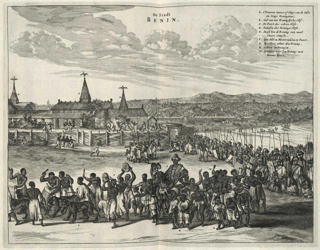 Der niederländische Geograph Olfert Dapper beschrieb den riesigen Palastkomplex des Königs so: »Es ist in viel prächtige wohnungen eingeteilet / und hat schöne lange viereckichte Lustgänge / die ohngefähr so groß seynd / als die Börse zu Amsterdam: doch einer ist grösser / als der andere. Das Tach derselben stehet auf hölzernen Seulen / welche von unten bis nach oben zu mit Missinge überzogen / darauf ihre Krieges tahten und Feldschlachten seynd abgebildet. [...] und ein ieder Gübel ist mit einem Türnlein gezieret / welches oben spitz zu leuft. Darauf stehen Vogel / von Kupfer gegossen / mit ausgebreiteten Flügeln / sehr künstlich nach dem Leben gebildet« (so Olfert Dapper, Umbständliche und Eigentliche Beschreibung von Africa, Und denen darzu gehörigen Königreichen und Landschaften [Amsterdam 1670] S. 486, s. hier Abb. 2)