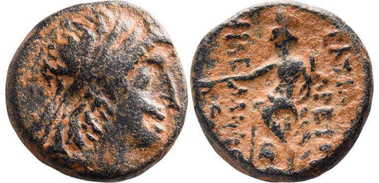 Rv.: Tyche von Damaskus, nach links auf einem Felsen sitzend, Turmkrone tragend, Füllhorn in der linken Hand haltend, rechte ausgestreckte Hand hält ein nicht identifizierbares Objekt, Flussgott unterhalb der Figur. Inschriften: ΒΑΣΙΛΕ[ΩΣ] / ΑΡΕΤΟΥ nach unten (rechts), ΦΙΛΕ-ΛΛΗΝΟ[Σ] nach unten (links), [A]P im linken Feld