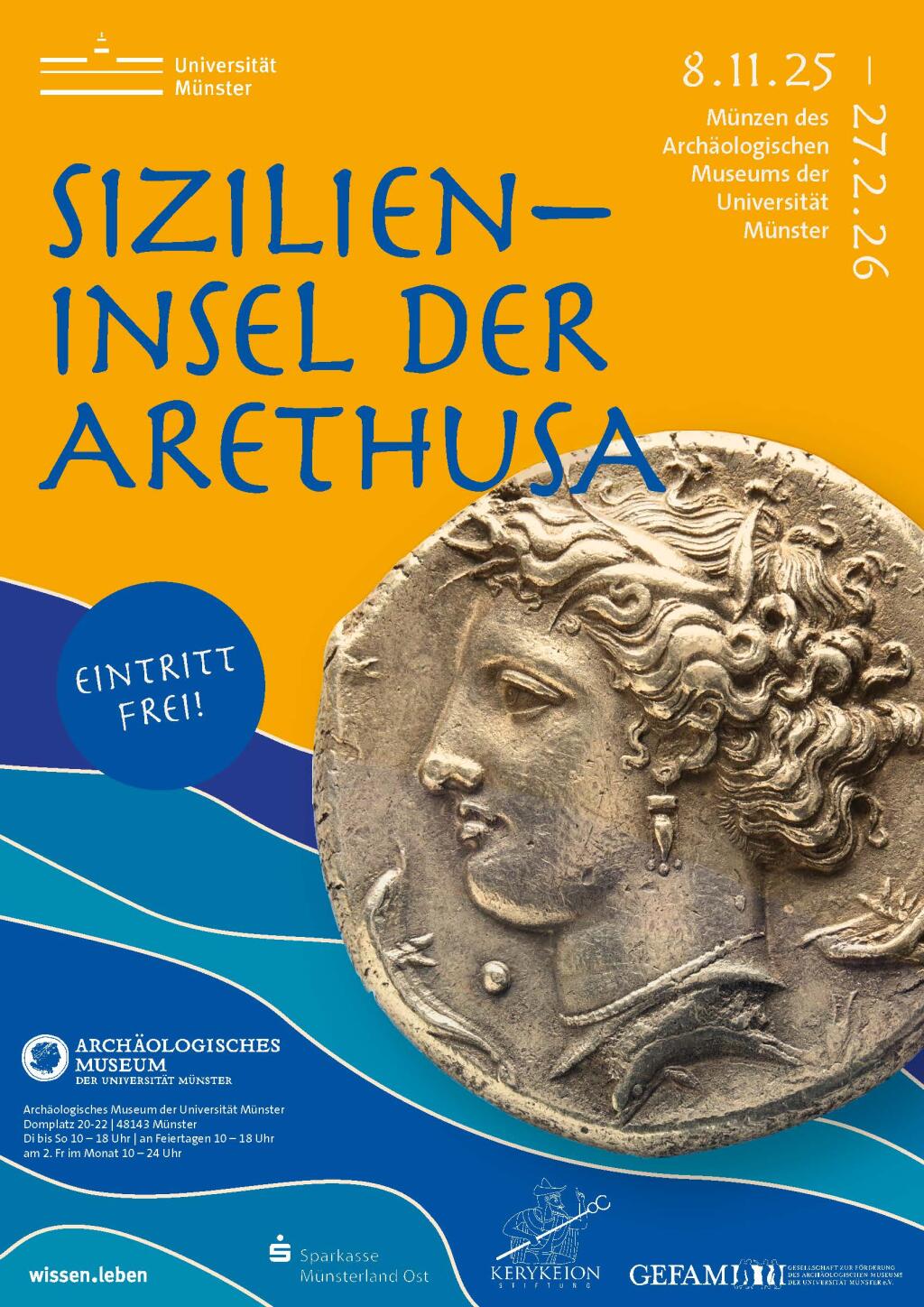 Derzeit läuft im Archäologischen Museum der Universität Münster die Ausstellung „Sizilien – Insel der Arethusa“: Namegeberin und roter Faden ist Arethusa, die Quellnymphe von Syrakus. Ihr Gesicht auf einer Dekadrachme aus der Hand des Stempelschneiders Euainetos ziert Plakat (Abb. 1) und Fensterfront und soll Besucherinnen und Besucher ansprechen und ins Museum locken.