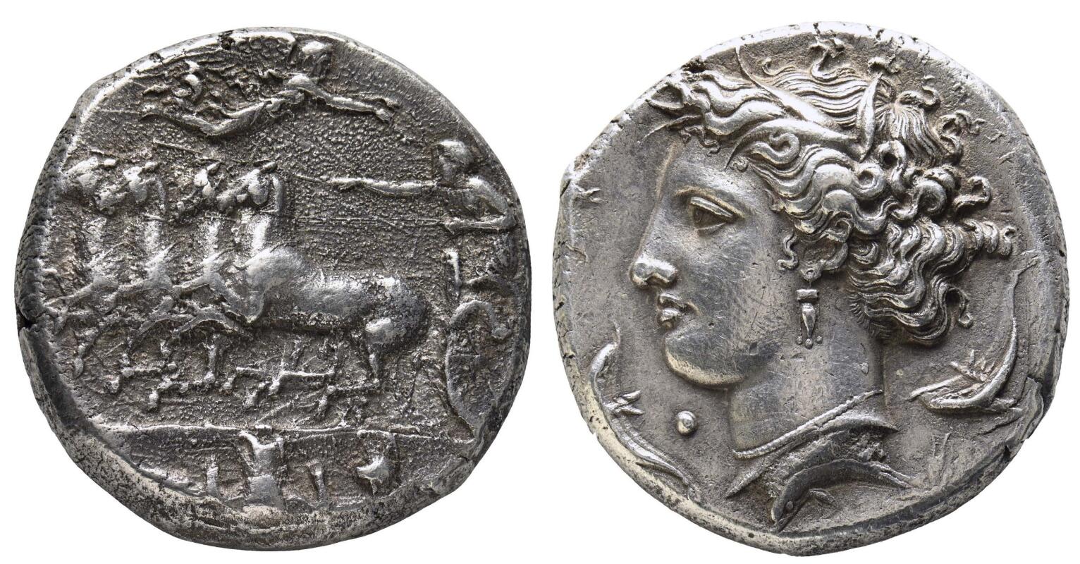 Rs. [ΣΥΡΑΚΟΣΙΩΝ]. Kopf der Arethusa n. l. mit Schilf bekränzt und links i. F. unter dem Kinn ein Punkt; gerahmt von vier Delfinen