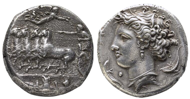 Ungewöhnlich erscheint uns heute die Position des Kopfes auf der Rückseite, ist doch die „Kopfseite“ üblicherweise die Vorderseite und zeigt die (göttliche) Identifikationsfigur des Münzherrn, der als Garant für den Wert des Geldes bürgt. Syrakus startet seine Silberprägung stattdessen mit einem Wagengespann auf der Vorderseite, das für die pferdesportbegeisterte städtische Elite steht und deren Siege als Ausdruck aristokratischer Lebenshaltung feiert. Hier übernimmt ein weltliches Motiv die Position, die eigentlich einer Gottheit gehört. Arethusa selbst ist zunächst nur ganz klein als Zentralbild inmitten des in archaischer Zeit geläufigen Quadratum incusum zu sehen (z.B. M 9050), und wird erst zum Ende des 6. Jahrhunderts v. Chr. über mehrere Serien hinweg zur zentralen Repräsentantin aufgebaut.