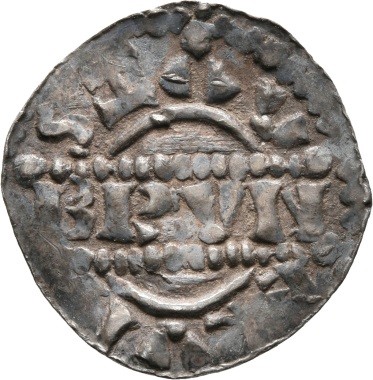 b) Erzbischof Bruno, Pfennig – Silber, geprägt; Gew. 0,66 g, Dm. 20 mm. Aus dem Fund von Bébange