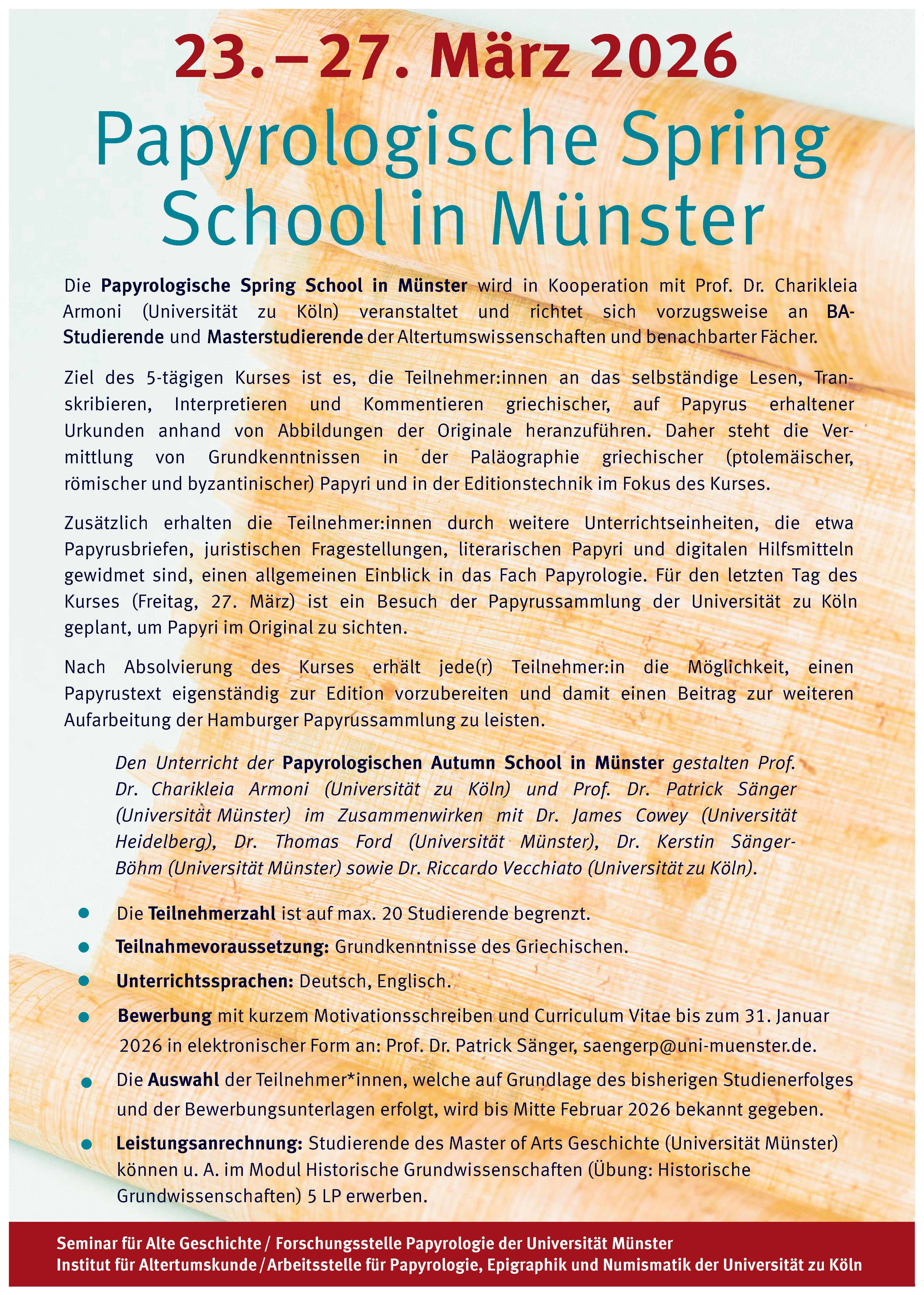 Die Papyrologische Spring School 2026 findet vom 23. bis 27. März 2026 statt. Das Angebot richtet sich in diesem Jahr insbesondere an Bachelor- und Masterstudierende der historischen Fächer.