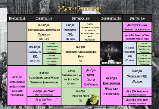 Bei weiteren Fragen zur O-Woche mailt uns gerne an: fsrphilosophie@uni-muenster.de.