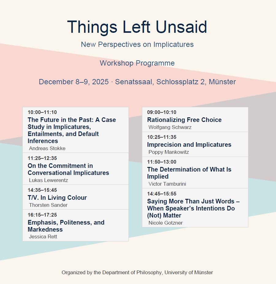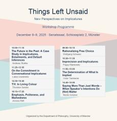 Am 8. und 9. Dezember 2025 findet an der Universität Münster der Workshop „Things Left Unsaid: New Perspectives on Implicatures“ statt. Das Programm umfasst Vorträge von Andreas Stokke, Lukas Lewerentz, Thorsten Sander, Jessica Rett, Wolfgang Schwarz, Poppy Mankowitz, Victor Tamburini und Nicole Gotzner.