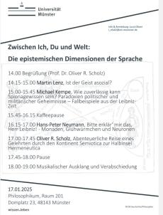 Tagung: Zwischen Ich, Du und Welt: Die epistemischen Dimensionen der Sprache Veranstalter*innen: Prof. Dr. Oliver R. Scholz; Lucia Oliveri Wann: 17.01.2024 Wo: Raum 201, Philosophikum, Domplatz 23, 48143, Münster