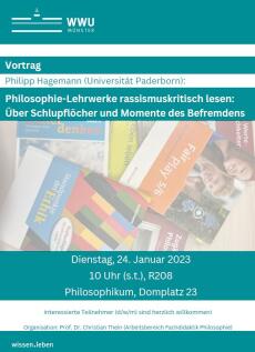 Am kommenden Dienstag, 24. Januar trägt ab 10:00 Uhr Philipp Hagemann (Universität Paderborn) in Raum 208 im Philosophikum vor zu: "Philosophie-Lehrwerke rassismuskritisch lesen: Über Schlupflöcher und Momente des Befremdens" Der Vortrag geht aus einem Promotionsprojekt zu einer kritischen Schulbuchanalyse für die Fächergruppe Philosophie/Ethik zu allen Jahrgangsstufen hervor. Die Veranstaltung wird organisiert von Prof. Dr. Christian Thein. Interessierte Studierende und Lehrende sind herzlich (ohne Voranmeldung) eingeladen.
