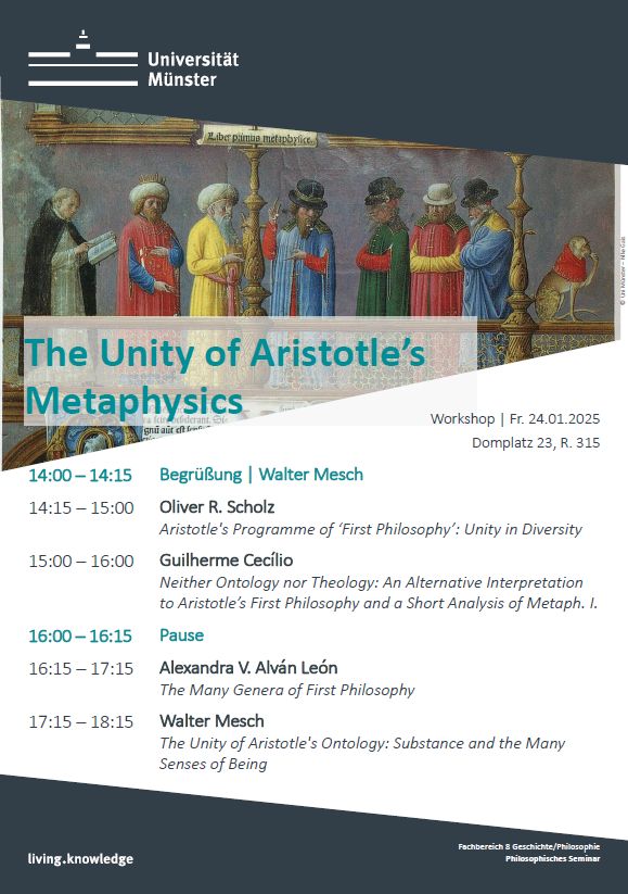 Anlässlich des Forschungsaufenthalts von Prof. Dr. Guilherme Cecílio aus der Universidade Federal do Estado do Rio de Janeiro (UNIRIO) im Philosophischen Seminar der Universität Münster findet am 24.01.2025 ein Workshop zum Problem der Einheit der aristotelischen Metaphysik statt.