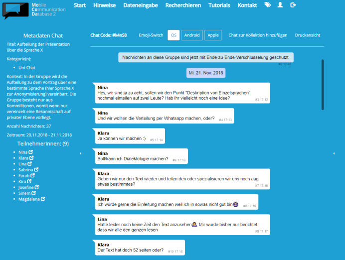 In dem Seminar entwickeln Studierende in Projektteams Forschungsfragen zur linguistischen Analyse digitaler Kommunikation und führen auf Basis der "Mobile Communication Database" (MoCoDa), einer frei zugänglichen Online-Datenbank mit gespendeten WhatsApp-Chats, eigenständig eine empirische Studie durch. "Die Ergebnisse sollten eigentlich in einem Abschlussworkshop mit Studierenden eines parallel an der Universität Duisburg-Essen stattfindenden Seminars präsentiert werden", berichtet Katharina König. Doch die Corona-Pandemie hatte in diesem Fall zur Folge, dass die digitale Kommunikation nicht mehr nur Seminargegenstand war, sondern ein wichtiger Bestandteil der Kommunikation in Seminarsitzungen, Methoden-Sprechstunden und Teamsitzungen wurde.